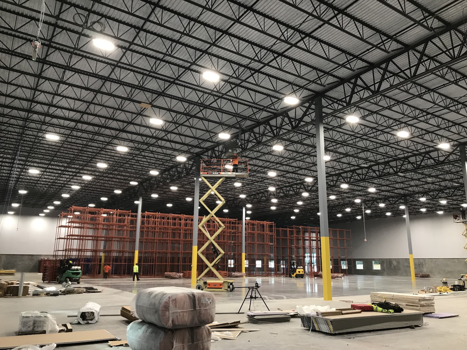 Led high bay fixtures in a newly constructed warehouse